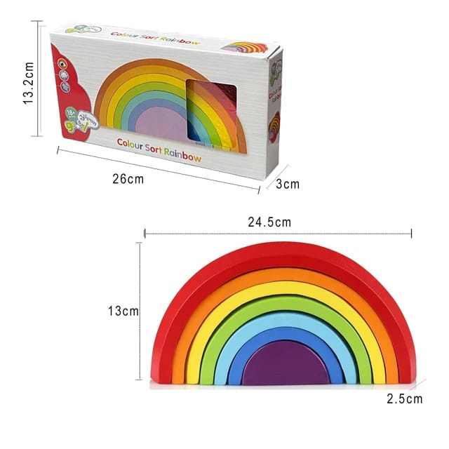 | Stacking pieces makes your child use his hands, arms, and fingers. Wooden stacking toys thus promote better hand-eye coordination and help develop gross and fine motor skills.|The Rainbow Stacker offers advantages beyond improved body coordination. Additionally, it fosters your child’s ability to solve problems. In order to stack pieces higher, a child can use logical reasoning to consider the size of the stack. It helps them in acquiring new skills.|These semi-circles in a spectrum of colours effectively enforce concrete concepts like sorting by size and colour. The arches can be combined to create many design patterns. Kids can stack these wooden objects in various architectural formations to see which ones topple over and which ones can support more weight.|Children can begin to comprehend abstract ideas and thoughts like their imagination through their experiences and engagement with the actual world. With this, they can construct the things they want to play with, moving them beyond the point when they can only use what they already have.|Since you can stack the Rainbow Stacker in unusual ways, it makes for a great holding toy. As your child develops, the rainbow will change to reflect their expanding imagination and increasing capacity for building intricate structures, further teaching them how to nest and stack. |