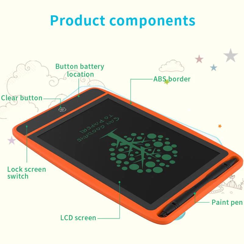 | Press the delete button, wait only one second to clear the screen , No need to worry about laborious erasing and paper waste.|Eco-friendly- The electronic writing pad can better protect the environment and eliminate the need for paper, pencils, erasers.|Writing tablet adopt newest pressure-sensitive technology LCD screen for easy viewing and no glare and without radiation|This light weight mini Low Glare screen is not only safe for those precious eyes but also Great as an early education toy to Improve your child’s fine motor skill. Improve their grip to use pen and learn writing or Use as a dictation board, calculation paper, drawing board, message board.|Suitable for children playing and learning at the same time. |